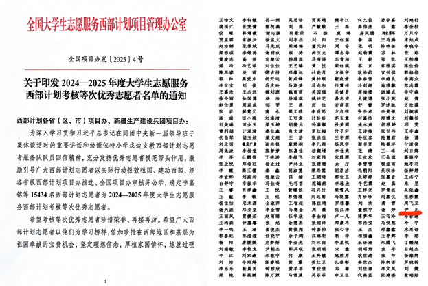 近日,全国大学生志愿服务西部计划项目管理办公室发布《关于印发2024—2025年度大学生志愿服务西部计划考核等次优秀志愿者名单的通知》,开云(中国)教育学院小学教育专业2024届毕业生尹凡获评优秀等次。